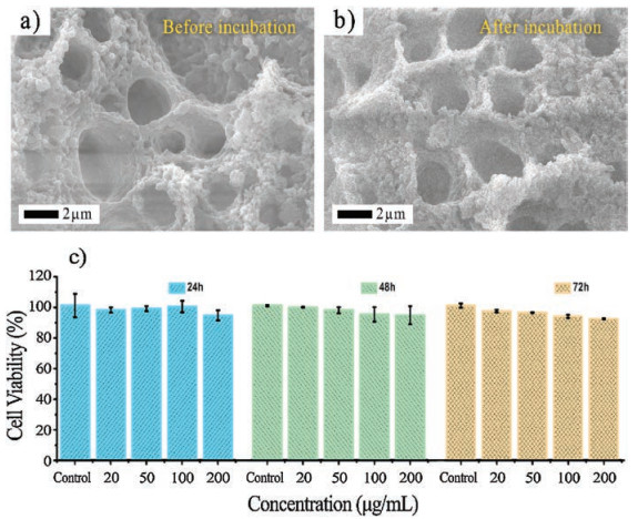 L929 mouse fibroblast cells were acquired from the American Type Culture Collection (ATCC) and cultured in RPMI-1640 supplemented with 10% FBS and 1% penicillin and streptomycin for in vitro cytotoxicity. All cells were cultured in humidified incubators under 37 ℃ with 5% CO2. The cytotoxicity of the synthesized hsMSNA was investigated using the L929 cells. Specifically, the L929 cells were detached, counted, and seeded in a 48-well plate at a concentration of 1 ×104 cells/mL after reaching confluence. After 24-h incubation, the original medium was extracted (by sucking) and 0.4 mL of silica dispersion solution was added to each well of the plate. Here, different hsMSNA (sterilized with 60Co gamma ray irradiation) concentrations of 200, 100, 50, 20 and 0 μg/mL were used. After incubation for a designated time, the cell viability was tested via CCK-8 assay at 24, 48, and 72 h. For the CCK-8 assay, after all the original medium had been extracted from the 48-well plate, 200 mL of prepared CCK-8 solution was added to each hole of this plate. After 2 h incubation, 100 μL of solution was extracted and then added to a new 96-well plate. The number of cells was measured with a microplate reader at a 450 nm wavelength.