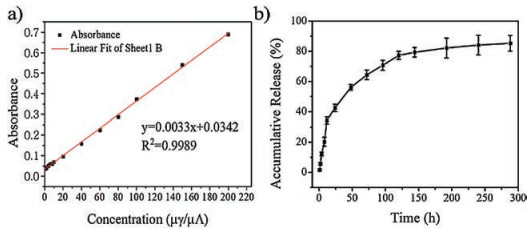 DOX was loaded into the hsMSNA as follows. Specifically, 0.1 mg DOX was added into 10 mL hsMSNA in PBS (5 mg/mL) at pH 7.4 and stirred at 37 ℃ for 24 h. Then the free DOX was removed via centrifugation and as-synthesized DOX-loaded hsMSNA were stored at 4 ℃. A dialysis method was conducted to assess the release profiles of DOX from DOX-loaded hsMSNA. Briefly, the weighted DOX-loaded hsMSNA were added into a pretreated dialysis bag (MWCO 4000 Da) and then the dialysis bag was placed into 50 mL of release medium (PBS, pH 7.4) at 37 ℃ and stirred at a shaking bath. At predetermined time intervals, 0.5 mL of the incubated medium was withdrawn to measure the amount of DOX using a microplate reader at 475 nm and then equal volume of fresh PBS was supplemented. The release profiles were conducted in triplicate.