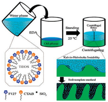 Scheme 1. Suggested mechanisms illustrating synthesis process of sieve-like structure of MSNs (hsMSNA) by centrifugationSpecifically, during the centrifugation process, the density (ρ) and velocity potential (U) of water phase and oil phase are different, and the static interface will move with a velocity