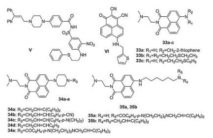 Compounds 33a-c, 34a-e, 35a and 35b were designed and synthesized [55] (Fig. 10). The basic hydrophilic amine chain was introduced to the N-imide position to maintain its cytotoxicity and the amino substituents were introduced to the 4-position of naphthalimide ring to avoid the side effect from N-acetylation and involve arrest of cell cycle. Their antitumor activities were evaluated against HeLa, A549, P388, HL-60, MCF-7, HCT-8 and A375 cancer cell lines in vitro. Most of these compounds showed comparable cytotoxicities over Ⅱ against tested cancer cell lines except for HCT-8 with the IC50 values of 10-6 to 10-5 mol/L. In most cases, the cytotoxicities increased in sequence of 35, 34 and 33, which indicated that the magnitude and conformation of alkyl/aryl substituents had intense influence on the cytotoxic activities of these compounds. For example, 34a was more cytotoxic than 35b but less cytotoxic than 33b. Moreover, the linkers in position 4 influenced their cytotoxicity. Compounds 33c and 35a bearing flexible alkyl linker showed a striking contrast compared to 34e bearing semi-rigid piperazin linker. Additionally, the cytotoxic activities of 34a-d were also influenced by the substituents on aryl moiety. When the substituents were phenyl and nitrile groups, relatively favorable cytotoxic activities were obtained.