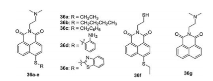 According to our previous research, thio-heterocyclic fused naphthalimides induced promising antiproliferative efficiency. However, little attention has been paid to simple thio-substituted naphthalimide derivatives. Based on the structure of 18a and structurally closely related thio-heterocyclic compounds described by Brana et al., we developed a series of non-ring fused derivatives containing sulfur in position 4 of the naphthalimide ring system 36a-e. Compounds 36f and 36g, lacking either N, N-dimethylaminoethyl side chain as an optimized pharmacophore concerning the interaction with the DNA backbone and with the topoisomerase enzyme or sulfur-containing substitution, were prepared as references (Fig. 11). Besides, due to the significant DNA photocleaving activities of thio or thiono naphthalimide derivatives in comparison with corresponding oxygen derivatives, the target compounds were further evaluated as phototoxic antitumor agents in vitro, which might widen their applicability concerning the use in photodynamic therapy.