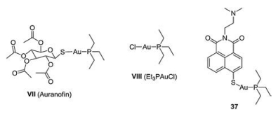 Gold complexes have recently gained attention because of their strong antiproliferative effects [57]. Furthermore, a strong inhibition of the enzyme thioredoxin reductase (TrxRa), which is involved in tumor cell proliferation, has been noted for many derivatives and an antimitochondrial mode of action for these complexes has been proposed [58]. The studies on the mode of action for Auranofin and other related gold complexes (e.g., the chloro analogue Et3PAuCl) indicated that the active species was the gold ion itself and the ligands were more relevant for the biodistribution and kinetic properties of the agents [59] (Fig. 12). Besides, the presence of the phosphine ligand is important for the biological potency of the complexes. Consequently, we considered creating an agent with the presence of the central gold atom, retention of the triethylphosphine moiety and the addition of an antiproliferative compound as ligand. N-(N', N'-dimethylaminoethyl)-4-mercapto-1, 8-napthalimide were chosen as the ligand which contains a heterocyclic naphthalimide core for DNA intercalation and a side chain containing a protonable nitrogen, which enables an initial contact to the DNA phosphate backbone.