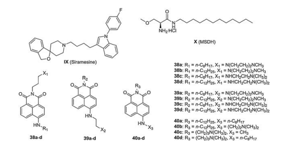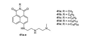 Naphthalimide derivatives 38a-d and 39a-d were functionalized at the N-imide and 4-position with polyamines and long alkyl chains. Compounds 40a-d were prepared as reference compounds (Fig. 13). All compounds except 40a and 40c exhibited better cytotoxic activity than Ⅱ in the tested cancer cell lines, which strongly demonstrated for the rationale of the design. Moreover, the introduction of polyamines in 38a-d and 39a-d reduced cell proliferation more significantly in the majority of these five cell lines than their monoamine precursors 40b and 40d.