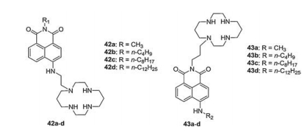 Due to the antitumor potency of azomacrocycles, cyclam was introduced to the N-imide and 4-position of naphthalimide instead of flexible basic side chain. Besides, lipophilic long alkyl chains were introduced to naphthalimide-cyclam conjugates in comparison with methyl and butyl substitution. Compounds 42c, 42d, 43c and 43d exhibited comparable or even more potent antiproliferative activity than Ⅱ, which stand for the rationale of naphthalimide-cyclam conjugates (Fig. 15). Besides, the introduction of long alkyl chain could improve the cytotoxic activity. For example, 43c and 43d were 4-6 fold potent than 43a and 43b on HeLa and HCT116 cell lines. Furthermore, 42c, 42d, 43c and 43d showed strong inhibition against both topo Ⅰ and Ⅱ. The representative compound 43c exhibited moderate DNA intercalation activity. Molecular modeling studies identified the possible interaction of 43c with molecular target by forming topoisomerase/DNA/drug ternary complex. Finally, derivatives with long alkyl chains could efficiently induce apoptosis [72].