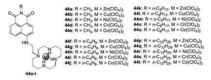 Cyclam can complex various transition metal ions with high kinetic and thermodynamic stability because of its strong affinity. It is reported that cyclam could chelate with Zn(Ⅱ) and Cu(Ⅱ) to inhibit cancer cell growth. The metal complexes (44a-t) (Fig. 16) of naphthalimide-cyclam conjugates (42a-d) were synthesized. According to our research, the Zn(Ⅱ) and Cr(Ⅲ) complexes exhibited comparable antiproliferative activities with Ⅱ via multiple tyrosine kinase inhibition. The representative compound 44p displayed broad-spectrum antiproliferative activity against 15 cancer cell lines with average IC50 value 10.18 ± 3.25 μmol/L, and effective antiangiogenic activity on human microvascular endothelial cells (HMEC-1) [73].