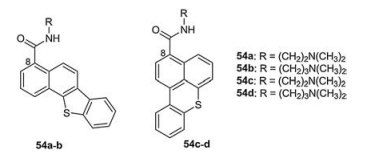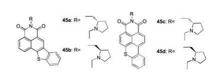 Several heterocyclic-fused naphthalimides (45a-d, Fig. 17) with chiral amino side chains were investigated. Their side chains' chiral configuration determines DNA binding activities in the order: S-enantiomers > R-enantiomers. And their DNA photodamage activites were in good agreement with their DNA binding constants, the S-enantiomers could photocleave circular supercoiled pBR322 DNA more efficiently than their R-enantiomers. S-Enantiomer 45b could photodamage DNA at 0.2 μmol/L and cleave supercoiled plasmid DNA from form Ⅰ to form Ⅱ completely at 50 μmol/L. Almost all of these intercalators showed effective cytoxicities against A549 and P388. S-Enantiomers showed different antitumor cytotoxicity by comparison with R-enantiomers [74].