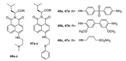 The target compounds were obtained by conjugating the leucine, arylamine and aliphatic amine functional groups to the naphthalimide ring. The amino substituents were introduced to the 4-position of naphthalimide ring to avoid acetylation and thereby to reduce the side effects. The introduction of arylamine to leucine moiety might result in favorable solubility and pharmacologic profiles. Furthermore, the introduction of thio group, known to facilitate the interaction of naphthyl heterocycles with DNA, might lead to a concomitant increase in the cytotoxicity against tumor cell lines. The antitumor activities of naphthalimides 46a-c and 47a-c were evaluated against HeLa, A549, P388, HL-60, MCF-7, HCT-8 and A375 cancer cell lines in vitro (Fig. 18). Most of the derivatives had moderate antitumor activities with the IC50 values of 10-6-10-5 mol/L. More importantly, 47a-c exhibited exclusive antitumor activities against MCF-7 cell line. DNA binding showed that these derivatives behaved as DNA intercalating agents. Serum albumin is the most abundant protein in plasma and functioned in the binding and transportation of various ligands such as fatty acids, hormones, and drugs. The distribution, free concentration, and metabolism of these ligands strongly depended on their binding properties with serum albumin. The verified formation of compound-BSA complex might provide some suggestions on the understanding of their exclusive antitumor selectivity against MCF-7 cell line [81].