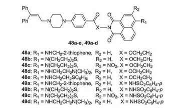 The antitumor activities of target compounds were evaluated against a variety of cancer cell lines in vitro. Preliminary results showed that most of the derivatives had cytotoxic activity comparable with that of Ⅱ, with IC50 values of 10-6-10-5 mol/L. Interestingly, 48e had the selective antitumor activity against MCF-7 among the cancer cell lines tested. More importantly, flow cytometric analysis indicated that compared with Ⅱ, the target compounds could effectively induce G2/M arrest and progress to apoptosis in HL-60 cells after double staining with annexin Ⅴ-FITC and propidium iodide. The present work provided a novel class of naphthalimide-based derivatives with potential apoptosis-inducing and improved antitumor activity for further optimization [82].