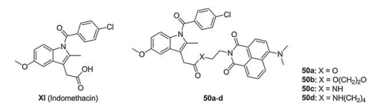 Compound ⅩⅠ (Indomethacin) is a member of the nonsteroidal anti-inflammatory drugs, which are widely applied in treatment of arthritis and cardiovascular diseases, cancer prevention, etc. [83-85]. It has been proven that indomethacin can induce G1 arrest and apoptosis of human colorectal cancer cells. Accordingly, naphthalimide-indomethacin hybrids with different linkers might have improved or different biological activity (Fig. 20). The naphthalimide scaffold was utilized as the key prototype structural unit, and dimethylamine and indomethacin functional groups were conjugated to the naphthalene ring. The dimethylamino substituent introduced at 4-position of naphthalimide is difficult to acetylate and might be involved in DNA synthesis arrest. Various (hydrophobic or hydrophilic) linkers were designed between naphthalimide and indomethacin in order to investigate their effects on biological activity, which might lead to concomitant increase in cytotoxicity against tumor cell lines. Introduction of an amide/ester moiety might result in different pharmacologic profiles and optimal therapeutic window for hybrids.