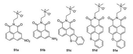 Ⅰ had inappropriate central nervous system (CNS) toxicity and Ⅱ had myelosuppression, vomiting, and erythra side effects, which hampered further studies. The cationic tertiary amine side chains on these agents played an important role on electrostatic binding affinity with DNA, which also ensured good uptake into cells, then interfered with the topoisomerase function to inhibit the tumors. In order to lower the toxicity and improve extravascular drug transport properties, the oxidized tertiary amine was introduced into the naphthalimide backbone to form a prodrug lead instead of original amino side chain. When the compounds were introduced into hypoxic cells, the tertiary amine N-oxides could be bioreduced to the corresponding tertiary amine and showed the high bioactivity of the amine. Of course, this process could be inhibited by oxygen. So, we designed, synthesized, and evaluated a series of novel potential anticancer agents as prodrug leads against hypoxic solid tumor [87].