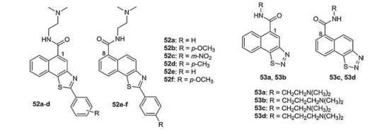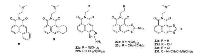 It is reported that Ⅲ was averagely 40-fold cytotoxic against a panel of human tumor cell lines than its unfused parent compound Ⅱ [37]. Interestingly, Ⅲ also showed much stronger cytotoxicity than its angular phenanthracene analogue M, indicating that the linear chromophore is preferred [38]. Unfortunately, only one kind of such linear agent, N, bearing a tetrahydroanthracene nucleus instead of anthracene, was further reported, which exhibited averagely lower cytotoxicity than Ⅲ [38]. Our group synthesized compounds 23a-f with an aminothiazole ring linearly fused to the naphthalimide skeletons in comparison with their angular thiazonaphthalimide counterparts 22a and 22b. (Fig. 4)