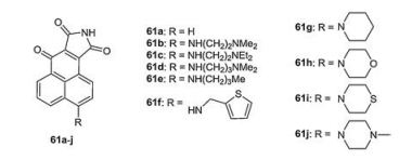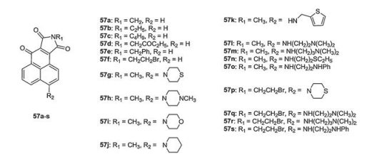 Meanwhile, more and more novel naphthalimide derivatives with favorable pharmacologic profiles have been synthesized and evaluated. From the point of view of antitumor drug targets, various mechanisms of action were proved in the past decade. For example, 4-amino-1, 8-naphthalimide was found to be potent PARP-1 inhibitor in 1992 [14]. Kiss et al. reported UNBS3157 as a pan-antagonist of CXCL chemokine expression [15]. Besides, more structural modifications were proved to efficient for naphthalimide antitumor agents recently. For example, 4-substituted analogues, which was believed to be weak intercalator or antitumor agent before [7], were synthesized to avoid N-acetylation and approved to be potent antitumor agents as their 3-substituted analogues [16]. More functional groups were introduced to N-imide position instead of basic side chains, and the derivatives were no longer limited by the structure feature of DNA intercalators.