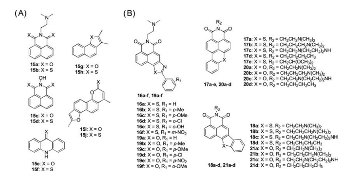 In our development of DNA photocleavers, the thiono-naphthalimides exhibited greater DNA intercalating and photocleaving ability than their oxo-counterpart, such as 15b vs. 15a (Fig. 3A) [31]. Then the thio-heterocyclic fused naphthalimides (16a-f, 17a-e, 18a-d) were designed and obtained [32-34]. They were tested of their DNA photocleaving activities and antitumor activities in comparison with their oxo-heterocyclic analogues (19a-f, 20a-d, 21a-d). The chemical structures of the synthesized compounds were listed in Fig. 3B. Herein, we will not describe the detail photocleaving activities in this review. As for the antitumor activities, the thio-heterocyclic fused derivatives could normally induce enhanced cytotoxicity than their oxo-containing analogues. Derivatives with N, N-dimethylethane-1, 2-diamine basic side chains are generally more potent than their analogues derivative, which was in consistence with previous reported naphthalimi-dederived DNA intercalators. For example, 17a and 18a exhibited significant antiproliferative activities with IC50 values at 0.14 μmol/L and 0.007 μmol/L for A549, respectively. For 19a-f and their surfur-containing analogues 16a-c, electron-donating groups improved the antitumor efficacy, like 19c vs. 19e. Besides, less cytotoxicity was observed against the normal cell line LO2 in contrast to tumor cell lines A549 and P388.