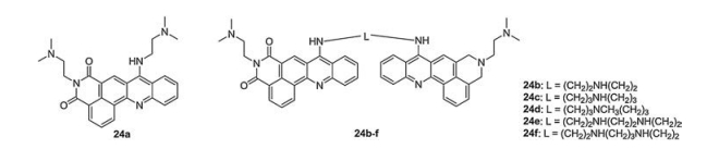 The dimeric heterocyclic-fused larger ring system attracted attention due to their high DNA affinity and antitumor activity [42]. As reported, bis-naphthalimide derivatives (like Ⅳ) have been studied for their cytotoxicity [43]. We designed novel mono- and bis-isoquinolino[4, 5-bc]acridine derivatives 24a-f which combined the structural feature of both naphthlimide and acridine chromophores [44]. As seen in Fig. 5, naphathalimide active group was remained and the acridine unit was effectively fused with electron-deficiency group. Besides, several polyamine chains ranging from 7.3-12.3 Å were used as linkers to bridge two heterocyclic-fused acridine chromophores. The target compounds were evaluated of their antitumor activities against A549 and P388. It is found that the dimers exhibited more active cytotoxicity than the mononuclear analogue, except for 24b. Besides, the linker greatly altered the antitumor activities of the target compounds. Compound 24f with polyamino alkyl chain linker exhibited decent antitumor activity against both A549 and P388 (0.025 μmol/L and 0.281 μmol/L, respectively). DNA binding study and molecular modeling of the 24e/24f DNA complexes indicated that 24f with the long enough linker could exhibit the higher DNA affinity than 24e, which contributed to its higher antitumor activity.