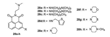 Compounds 28a-h were synthesized by three steps including bromination, amination and Cu/L-proline catalyzed coupling reaction from naphthalic anhydride (Fig. 7). They showed potential anticancer activities against HeLa and P388D1 cell lines in vitro. Compounds 28a, 28b and 28h exhibited even better activity than Ⅱ with the IC50 values mainly at submicromolar range, which was consistent with their Scatchard binding constants (Kb). The DNAbinding properties of 28a and 28h were evaluated via fluorescent spectra, UV-vis absorption spectra, CD spectra, and viscosity titration with calf thymus DNA (CT-DNA) in comparison with Ⅱ. The DNA-binding studies revealed that they bind DNA via similar mode of Ⅱ [48].