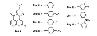 3-Non-amino aromatic substituted naphthalimides 29a-g were synthesized starting from naphthalic anhydride by three steps including bromination, amination and Suzuki reaction by Pdcatalyst to improve antitumor activity and avoid side effects (Fig. 8). The Suzuki-Miyaura cross-coupling reaction (also named Suzuki reaction) has evolved into a most effective strategy for carbon-carbon (C—C) bond formation. It is less expensive and less toxic compared with Stille reaction employed by Brana's synthetic method. All the new naphthalimides except 29b exhibited similar or stronger antiproliferative activity than Ⅱ against HeLa and P388D1 cell lines in vitro. Therefore, it can be deduced that the "nonfused" strategy can be applied to develop the anticancer naphthalimides. These could avoid the side effect of Ⅱ as they lack amino group at the 3-position. Compound 29a and its heteroacryl substituted analogue 29g (thiophene is a bioisostere for benzene) were studied of their DNA-binding studies. The representative compounds could bind to DNA via intercalation in different fashion [50].