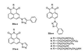 On one hand, 1, 2, 3-triazole instead of amino was linked to 3-site of naphthalimide as counterparts of Ⅱ to improve the biological activities and reduce drug resistance (Fig. 9). The target compounds 30a-e and 31a-e were obtained by azide-alkyne click reaction with high yields and simple purification steps from the starting material 3-nitro-1, 8-naphthalic anhydride. The antitumor activities of the targets compounds were evaluated against MCF-7, HeLa, and 7721, which proved that this reconstruction improved the cytotoxicity of the compounds (30a, 30b, 30e, 31a, 31b and 31e) compared to Ⅱ. The potency was closely related with the side chains, and the presence of a basic terminal group in the side chain was essential for cytotoxic activity. In particular, compound 30a were 5.6-fold, 2.4-fold, and 8.5-fold more potent than that of Ⅱ against the three tested cell lines, respectively. The representative compounds 30a and 31a were evaluated of their DNA intercalating properties. Compound 30a had a good ability of DNA affinity. The binding constant of 30a with DNA was 5.10 × 105 L/mol, by UV-vis spectra due to its weak fluorescence and the Scatchard binding constant of 31a was determined to be 3.51 × 105 L/mol by fluorescence spectroscopy technique. The results suggested that the 30-DNA complex was more stable with the aid of large π-conjugated systems formed by the phenyl linked to the 1, 2, 3-triazole of 30a. The result from viscosity measurement was also parallel to their DNA binding constants [51].