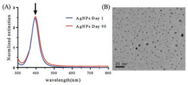 Figure 1. (A) UV–vis absorption spectra of the AgNPs solution. The arrow indicates the maximum absorbance at 395 nm. (B) TEM image of the AgNPs with the scale bar of 20 nmFigure 2