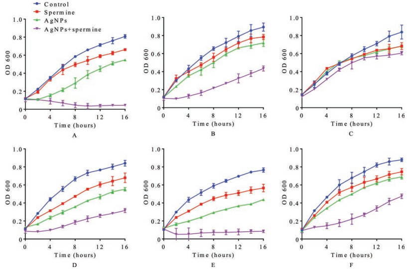 Figure 3. Time-killing curve of MRSA isolates in the presence of spermine and/or AgNPs. Time-killing assay was performed in the MH broth with control (blue circle), AgNPs alone (128 μg/mL, red square), spermine alone (1 mmol/L, triangle), and both (purple inverted triangle). (A) isolate ATCC BAA-1026; (B) isolate MRSA-18-122; (C) isolate MRSA-29-217; (D) isolate MRSA-29-238; (E) isolate MRSA-29-256; (F) isolate MRSA-29-227 (For interpretation of the references to colour in this figure legend, the reader is referred to the web version of this article)Table 1