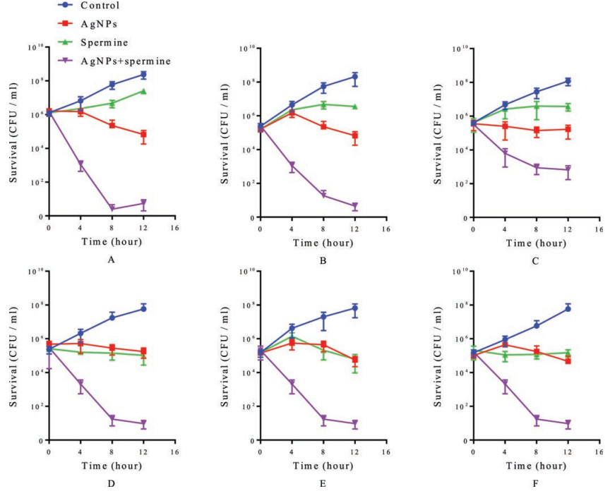 Figure 3. Time-killing curve of MRSA isolates in the presence of spermine and/or AgNPs. Time-killing assay was performed in the MH broth with control (blue circle), AgNPs alone (128 μg/mL, red square), spermine alone (1 mmol/L, triangle), and both (purple inverted triangle). (A) isolate ATCC BAA-1026; (B) isolate MRSA-18-122; (C) isolate MRSA-29-217; (D) isolate MRSA-29-238; (E) isolate MRSA-29-256; (F) isolate MRSA-29-227 (For interpretation of the references to colour in this figure legend, the reader is referred to the web version of this article)Table 1