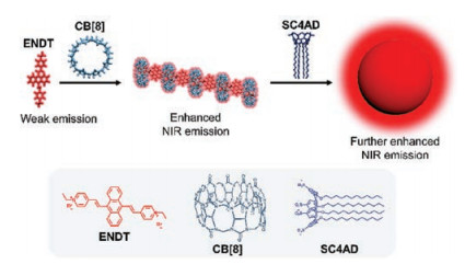 Recently, Liu and coworkers from Nankai University reported a supramolecular assembly with NIR emission for lysosometargeted cell imaging [4]. This two-step approach took advantages of the complexation of both cucurbituril and amphiphilic calixarene (Fig. 1). In the first step, encapsulation of cucurbit[8] uril (CB[8]) gives rise to J-aggregation of an anthracyl pyridinium derivative (ENDT), accompanied with emission enhancement and red-shift. In the second step, the fluorescence of the ENDT/CB[8] complex was further enhanced through lower-rim dodecylmodified sulfonatocalix[4]arene (SC4AD) induced aggregation.