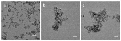 The size and morphology of CA-IONP, CS-IONP and FA-g-CSIONP were studied by TEM. CA-IONP (Fig. 1a) presented good dispersity in water, and a broad size distribution spanned from 4 nm to 20 nm. CS-IONP (Fig. 1b) and FA-g-CS-IONP (Fig. 1c) revealed the encapsulation of IONPs in clusters with sizes around 200 nm. The formation of such aggregated clusters might be due to the protonation of amine groups all along the polymer chains (chitosan and FA-g-CS) in the acidic reaction medium during the surface modification step, which was linked to carboxylic groups in multiple particles [18].