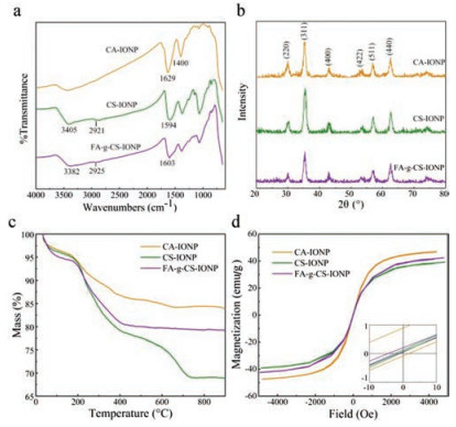 The crystalline structure of CA-IONP, CS-IONP and FA-g-CSIONP was characterized by powder XRD analysis. The XRD pattern of CA-IONP (Fig. 2b) contained the peaks at 2θ values 30.1°, 35.5°, 43°, 53.9°, 57.6° and 62.8° corresponding to the (220), (311), (400), (422), (511) and (440) planes of magnetite, the values were compliant with those reported earlier [20]. After modified with chitosan or FA-g-CS, the same characteristic peaks were exhibited, indicating that CS-IONP and FA-g-CS-IONP retained the crystalline structure of magnetite.