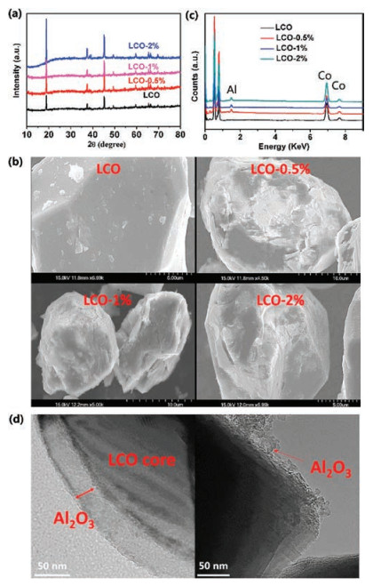 Metal oxide coatings on the surface of LCO (e.g., by atomic-layer deposition, or ALD) has been demonstrated to suppress material degradation, cobalt diffusion, and dissolution during the charge/ discharge process, leading to larger capacity, much more stable cycling performance, and higher output voltage [14-17]. However, due to the expensive instrument, slow deposition rate and chemical limitation [18], the cost of ALD for surface coating is not economical and cannot be effectively applied for large-scale manufacturing. In this communication, we report a facile sol-gel method for Al2O3 coating on the surface of LCO to improve the capacity and cycling-life performance. The capacity and cycling behaviour of an Al2O3-coated LCO material was evaluated in coin cells versus lithium metal with various C rates (0.2-2 C rate) between 4.5 V and 3 V for different weight percentage coatings. More importantly, we combine the electron microscopy and X-ray absorption spectroscopy (XAS) to investigate the failure mechanism for the surface coating.