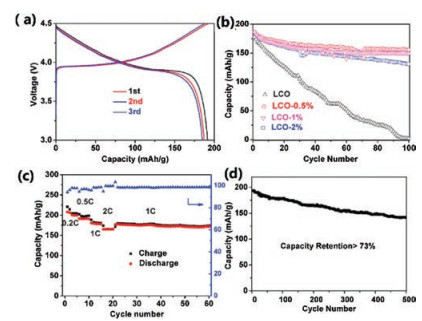 Since the early 1990s when lithium-ion batteries (LIBs) were first commercialized, they have emerged as an important energy storage device for portable electronics [1-3]. LiCoO2 (LCO), due to its good energy capacity and stable cycling performance, is still an important cathode material in commercial LIBs [4]. With the fast development of electric vehicles (EV) and hybrid electric vehicles (HEV), consumer demand is driving research for batteries with higher storage capacity, better cycling stability, and greater power output. However, current LCO-based LIBs are operated at 3.9 V with only ~140 mAh/g in capacity, which is insufficient for EV to drive 300 miles that is common for gasoline-based vehicles. As the theoretical operating voltage for LCO is 4.5 V, one strategy is to increase the voltage of LCO with enhanced capacity (up to 272 mAh/g in theory at 4.5 V), thus improving the battery output energy density [5-7].