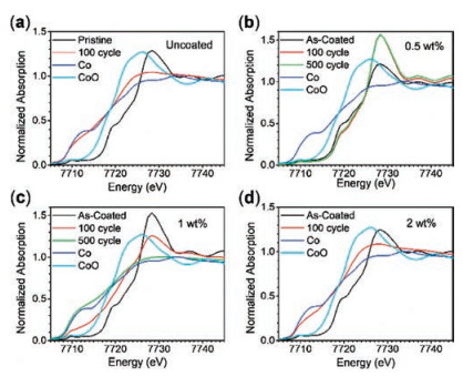 X-ray absorption near edge structure (XANES) and extended Xray absorption fine structure (EXAFS) experiments were carried out at beamline 5BM-D of DND-CAT of Advanced Photon Source (APS), Argonne National Laboratory (ANL). The following electrode materials were used: pristine LiCoO2 (LCO), LCO-0.2% (0.2 wt% Al2O3 coated LCO), LCO-0.5%, LCO-1%, and LCO-2% cathodes after 100 and 500 cycles. Samples were placed in a chamber with helium flow as the protection. A Vortex ME4 detector was used to collect the Co K transmission signal while a Si(111) monochromator scanned the incident X-ray photon energy through the Co K absorption edge. The X-ray beam was calibrated using a Co metal foil and CoO was used as the reference. Data reduction, data analysis, and EXAFS fitting were performed with the Athena, Artemis, and IFEFFIT software packages. Standard procedures were used to extract the EXAFS data from the measured absorption spectra. The pre-edge background was linearly fitted and subtracted. The post-edge background was determined using a cubic-spline-fit procedure and then subtracted. Normalization was performed by dividing the data by the height of the absorption edge at 50 eV.