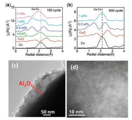 To understand the mechanism of the fading for bare LCO and coated samples, Co K-edge XAS measurements were carried out, as XANES can probe the oxidation state changes of Co in LCO after cycling and EXAFS can check local structure changes of LCO. In our previous studies, we have successfully applied XAS to investigate the catalyst restructurating [25, 26], lithium-battery reversible changes [27, 28], and cation site distributions for spinel pseudocapacitors as well as electrocatalysts [29, 30]. As shown in Fig. 3, we compared the XANES spectra of LCO, LCO-0.5%, LCO-1% and LCO-2% after 100 cycles and 500 cycles. It is observed in Fig. 3a that the Co edge of bare LCO after 100 cycles shifts to lower energy close to Co metal reference, suggesting that the bare LCO turns to metal cobalt. In contrast, the XANES edges of LCO-0.5% after 100 and 500 cycles in Fig. 3b alignwell with that of the pristine LCO. The good stability in Co oxidation state is consistentwith the excellent electrochemical performance of LCO- 0.5%, indicating the good protection of 0.5 wt% Al2O3 coating. Interestingly, higher Al2O3 surface coating cannot prevent the degradation of LCO, as both LCO-1% and LCO-2%, after 100 cycles show different degrees of Co edge shifts of XANES towards lower energy to overlap with Co metal. Although Co in LCO-1% after 100 cycles are partially reduced as shown in Fig. 3c, after 500 cycles LCO-1% completely becomes Co metal. These oxidation state changes provide clues of LCO failure in cycling: the reduction of Co3+ to Co0 metal leads to the degradation of LCO. These changes are further supported by EXAFS results in Fig. 4a. After 100 cycles, bare LCO and LCO-2% completely transfer to the cobalt metal, as the dominant peak located at 2.2 Å corresponds to the Co-Co metallic bond, as compared to the Co metal reference. LCO-0.5% still shows two sharp peaks located at1.5 Å and 2.6 Å (referred to Co-O and Co…Co of Co-O-Co scattering paths, respectively), while such two peaks in LCO-1% become broad, suggesting the partial change of LCO structure with 1 wt% Al2O3 coating and consistent with the XANES results. LCO-1% is better than bare LCO, but worse than LCO-0.5%. When the cell cycles 500 times, LCO-1% eventually becomes cobalt metal. The similarity in all EXAFS spectra of LCO-0.5% is indicative of its robust structurein battery performance.Differentfrom conventionalview, we conclude that the fading mechanism at higher cut-off voltage is the result of structure change from LiCoO2 to cobalt metal.