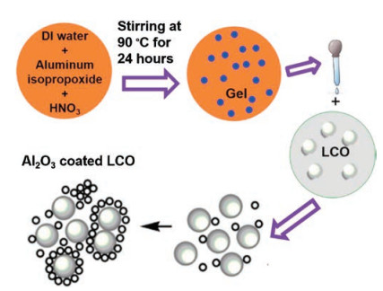 LiCoO2 (battery grade) was purchased from Sigma-Aldrich. The LiCoO2 electrode powders have an average particle size of ~10 μm. To obtain the Al2O3 coated LiCoO2, aluminum isopropoxide was dissolved in DI water at 90 ℃ for 1 h, after 5 drops 70% HNO3 solution adding, followed by stirring 24 h at 90 ℃. The obtained uniform sol was added to the LiCoO2 powder solution. The gel was formed after stirring 2 h at room temperature. The gel was heattreated at 600 ℃ for 5 h. The obtained samples are marked as LCO-0.5% (LiCoO2-0.5 wt% Al2O3), LCO-1%, and LCO-2%, respectively, which depends on the surface coating amount. The schematic illustration was shown in Scheme 1.