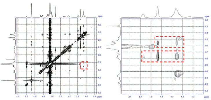 PAE-β-CD and PEG-AD could form inclusion complexes via the host-guest interaction between β-CD and adamantane. To examine this interaction between polymers, the freeze-dried blank micelle was dissolved in D2O, and the two-dimensional nuclear overhauser effect spectroscopy (2D-NOESY) NMR spectra were recorded. As shown in Fig. 1, the correlations between protons on C3 and C5 of β-CD(δ3.5~3.8) and protons of adamantane (δ 1.6~2.0) were clearly observed, indicating that the supramolecular polymer was successfully obtained.
