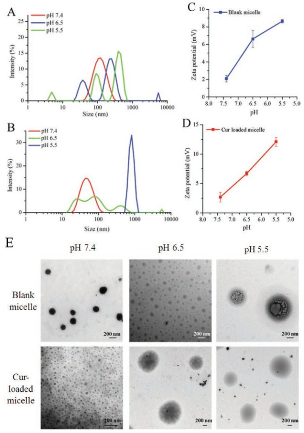Cur-loaded supramolecular micelles were prepared with the similar method as the blank micelles except that Cur was added and dissolved into the sonicated solution. The loading content (LC) could reach 6.16%, and the encapsulation efficiency (EE) was 85.5%. After encapsulating Cur, the particle size of drug-loaded micelle was significantly reduced. As shown in Fig. 2B, at pH 7.4, the size measured by DLS was 48.2 nm, and the PDI was about 0.126. The reason of this phenomenon may be the interaction between the polymer material and the drug [26], which made the hydrophobic core denser. Similar phenomena have been reported in the previous literature [27]. When the pH was lowered, the size of the Cur-loaded micelles had similar changes to the blank micelles. It can be seen from DLS (Fig. 2B) and TEM (Fig. 2E) that the particle size of the micelle became large and the micelles were uneven. At pH 5.5, the particle size of the Cur-loaded micelles increased to approximately 800 nm, indicating that the Cur-loaded micelles significantly decomposed at this pH value. The zeta potential of the Cur-loaded micelles increased from 2.68 mV to 12.1 mV (Fig. 2D), which had the same trend as changes in blank micelles.