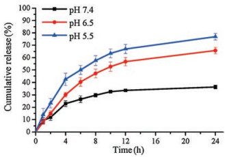 The drug release behavior of Cur-loaded micelles was examined at three pH values of 5.5, 6.5, and 7.4. Fig. 3 shows that the release of Cur from the micelles was varied clearly at different pH circumstance. At pH 7.4, the cumulative release of Cur within 24 h was less than 40%. When the pH was 6.5, the release of Cur increased significantly, and about 65% of the drug was released within 24 h. When the pH was set to 5.5, the release amount was further increased. The cumulative release of Cur exceeded 40% in 4 h and about 80% of Cur could be released in 24 h. The result indicated that the Cur-loaded micelles had obvious pH responsiveness due to the transition of PAE from hydrophobic to hydrophilic as discussed above. The tertiary amine groups on the PAE segments were protonated in acid condition, and the hydrophobic core formed by PAE became hydrophilic, which led to the collapse of the Cur-loaded micelles. Thus, the Cur encapsulated in the micelle was released, and the cumulative release rate varies significantly depending on the pH value.