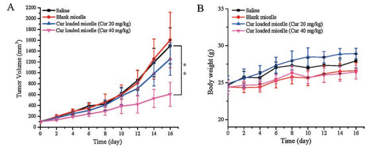 The in vivo antitumor effect of the different formations was determined using S180 tumor bearing mice. The mice treated with saline served as control group. The blank micelle was used to study the toxicity of carrier in vivo. The mice of experimental groups were treated with two different doses of Cur-loaded micelles. Fig. 4A shows the tumor growth condition during the experiment. The mice treated with high dose of Cur-loaded micelle (Cur 40 mg/kg) showed obviously smaller tumor sizes than other three groups, and the tumor inhibition rate reaches 62.14% when compared with the control group. Mice treated with blank micelles exhibited similar fast growth rate as those treated with saline and low-dose drug treated mice (Cur 20 mg/kg) showed slight therapeutic effects. The photos of collected tumor at the end of treatment showed the same result (Fig. S9 in Supporting information). What is more, no significant differences in body weight were observed between the different groups of mice (Fig. 4B), which indicated that the micelles were safe in vivo. Through the above experimental analysis, it can be known that the Cur-loaded micelles have an acceptable anti-tumor effect at a relatively high dose.