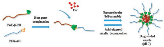 Poly(β-amino ester) (PAE) is a kind of typical pH-responsive polymers which can transform hydrophobic form to hydrophilic form in weakly acid condition because of the protonation of the tertiary amine groups in the main chain [10]. PAEs with different modification have been universally used to encapsulate various kinds of drugs [5, 11-13]. However, these polymer materials were predominantly built via covalent-connection and in most cases needed complex synthetic procedures to make polymer structure meet the requirement of its self-assembling into micelles. To solve this problem, micellar nanoparticles structured by non-covalent interactions are preferably tried.