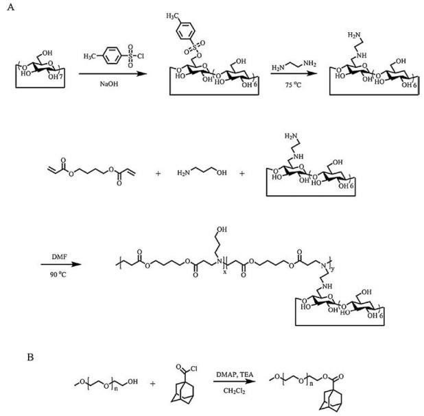 However, only a few studies combined host-guest recognition with stimulating responsive polymers. Herein, we report a pHresponsive supramolecular micelle consisting of a hydrophobic PAE core and a hydrophilic PEG shell based on the host-guest interaction between β-cyclodextrin (β-CD) and adamantane (AD) for drug delivery (Scheme 1). β-CD possesses a hydrophobic central cavity suitable for the inclusion of various guest molecules. The size of AD is almost completely adapted to the cavity of β-CD, and once complexed, AD fits deep in the β-CD cavity [20]. The association constant Ka is as high as 1 ×105 mol-1 [21]. The host molecule β-cyclodextrin-contained poly(β-amino ester) (PAE-β-CD) and guest molecule adamantyl-terminated poly(ethylene glycol) (PEG-AD) were synthesized. They formed host-guest inclusion complexes and further self-assemble into micelles. Curcumin (Cur) was chosen as the model drug to be loaded into micelles for its anticancer effect [22]. The pH responsiveness of supramolecular micelle and its drug loading ability were investigated, and the pH-triggered drug release behavior was also examined. Besides, the antitumor efficiency was evaluated both in vitro and in vivo.