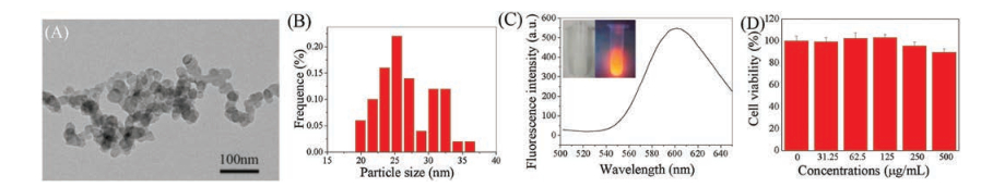 Figure 1. (A) TEM images of Mn-doped ZnS QDs. (B) The diameter histogram of the Mn-doped ZnS QDs. (C) Emission spectra of Mn-doped ZnS QDs, excited at 350 nm. Inset: photographs of Mn-doped ZnS QDs under daylight lamp and UV light by a 365 UV lamp. (D) The viability of Hep G2 cells with different concentrations of Mn-doped ZnS QDs.The biocompatibility of Mn-doped ZnS QDs was assessed by the cytotoxicity of Mn-doped ZnS QDs investigated. The methylthiazol tetrazolium (MTT) assay with Hep G2 cells result indicated that the viability of cells remained unchanged when the cells were exposed to Mn-doped ZnS QDs in the range of 0–500 μg/mL (Fig. 1D). The cell viability was still nearly 90% even after incubation for 24 h at the highest tested concentration of 500 μg/mL. This result suggests that Mn-doped ZnS QDs are highly biocompatible.