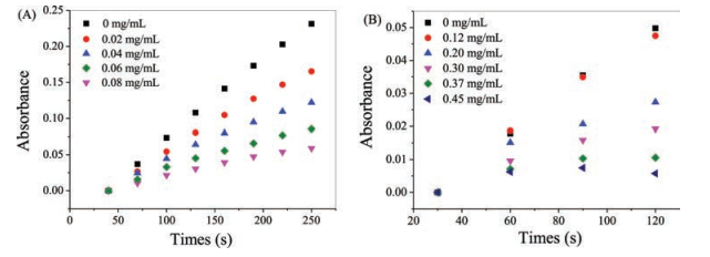 Figure 2 (A) The time-dependent absorbance changes at 325 nm of SOD activity detection system by improved Marklund method with the absence or presence of various concentrations of Mn-doped ZnS QDs. (B) The time-dependent absorbance changes at 550 nm of SOD activity detection system by McCord method with the absence or presence of various concentrations of Mn-doped ZnS QDs.