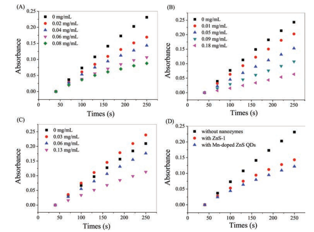 Figure 4. (A) The time-dependent absorbance changes at 325 nm of SOD activity detection system with the absence or presence of various concentrations of ZnS-1. (B) The timedependent absorbance changes at 325 nm of SOD activity detection system with the absence or presence of various concentrations of ZnS-2. (C) The time-dependent absorbance changes at 325 nm of SOD activity detection system with the absence or presence of various concentrations of ZnS-3. (D) The time-dependent absorbance changes at 325 nm of SOD activity detection system with the absence or presence of 0.04 mg/mL ZnS-1 or Mn-doped ZnS QDs.In conclusion, the Mn-doped ZnS QDs with SOD-like activities were synthesized by a facile and one-pot method. The activity of Mn-doped ZnS QDs as SOD mimics is evaluated using the improved Marklund and McCord method. The Mn-doped ZnS QDs show more resistant to pH than SOD, especially in acidic environments. The Mn-doped ZnS QDs can still keep good mimic enzyme activity at room temperature for 6 months. The results showed that ZnS had the activity of SOD like enzyme, but weaker than Mn-doped ZnS QDs. This Mn-doped ZnS QDs nanozymes with low cost, simple synthesis, white, non-toxic provides a new promising application material for the application of SOD.