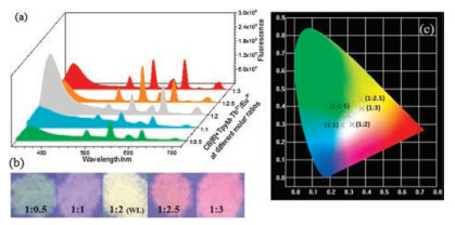 Figure 4. (a) Solid fluorescence emission spectra and (b) corresponding photos (under 254 nm light) of CB[8]/TpyM-Tb3+/Eu3+ at different molar ratios 1:0.5 (0.30, 0.35), 1:1 (0.27, 0.30), 1:2 (0.32, 0.30), 1:2.5 (0.37, 0.44), 1:3 (0.38, 0.39) (λex = 290 nm). (c) The 1931 CIE diagram showing the points of color changes based on the fluorescence emission spectra.In summary, a wire-like supramolecular assembly based on terpyridine/lanthanide complexes as fluorophores and cucurbit[8]urils as connectors was successfully constructed. Significantly, this supramolecular assembly possessed a CB[8]-induced enhancement of solid state fluorophore, probably because of the unique 1:2 bindingofCB[8]cavity towards the cationic guestsand theformation of ordered fibrous supramolecular system. By smartly adjusting the ratio of rare earth ions, multi-color lanthanide luminescence, especially white light, were obtained. We do believe that the wire-like supramolecular assembly with a convenient approach and tunable enhanced lanthanide luminescence would become one of the most promising smart lanthanide luminescent materials.