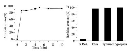 Figure 1. NIRDRS spectra of (a) adsorbent materials, (b) fsDNA powder, fsDNA adsorbed on TiO2 sample and TiO2 powder. The inset is a magnified image of the spectra in the range of 4600-4250 cm-1.To investigate the effect of time on the adsorption, the adsorption rate of fsDNA onto TiO2 was measured. Fig. 2a shows the variation of adsorption rate at different adsorption time for the experiment using 100 mL of 0.800 μg/mL fsDNA aqueous solution and 400 mg TiO2 powder. The adsorption rate was calculated by measuring the absorbance intensity of the supernatant after the adsorption at 260 nm. Clearly, the adsorption rate can be as high as 86.5% in 1 min adsorption. The result may be due to the abundant availability of active site on TiO2 powder and the fastness of the electrostatic attraction. To ensure a high adsorption rate, 5 min was used for the adsorption. To investigate the selective adsorption of fsDNA on TiO2, interfering substances of sodium chloride, potassium chloride, D-glucose, BSA, tyrosine and tryptophan were added to the solution for simulation of biological samples. As shown in Fig. 2b, the percentages of the residual content of BSA, tyrosine and tryptophan after the adsorption are almost 100%. However, the percentage of the residual content of fsDNA is only 4.97%. The results clearly demonstrate that the presence of fivefold BSA, tyrosine and tryptophan (4.000 μg/mL) does not have any interference to the adsorption of fsDNA when fsDNA concentration is only 0.800 μg/mL. Therefore, because of the selective adsorption, the presence of interferences does not affect the accuracy of the determination.