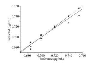 To investigate the predictability of the optimized model, the spectra of the 13 samples with interferences were used for an external validation. Among the validation samples, two samples with one duplicate and three samples with two duplicates were used to investigate the repeatability of the method. The same conditions were used for the adsorption and the spectral measurements. Fig. 3 shows the relationship of the predicted values by the optimal model and reference concentrations of the analyte. The straight line is fitted by least squares regression, and the dot line is the diagonal of the plot. A good linearity is obtained, although there is a slight deviation between the two lines. It can be seen that all the predicted concentrations are reasonably distributed along the straight line. The values of R and RMSEP are 0.9727 and 6.06×10-3 μg/mL, respectively. The recoveries of the 13 samples are calculated and the results are in a range of 98.2%–100.7%. For the two paired samples, the differences between the two predicted values are less than 0.013 μg/mL. Moreover, relative standard deviations (RSDs), calculated from the three predicted values of the triplicate samples, are 0.96%, 0.62% and 0.14%, respectively. These results demonstrate that the repeatability of the method is acceptable, and the method is less interfered by interference substances in the system.