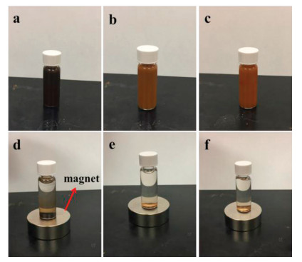 Magnetic nanomaterials are a new type of adsorbent materials with high adsorption capability and super magnetic separation performance [16]. They are easy to be separated from liquid medium under external magnetic field. Compared with traditional adsorbents, magnetic nanomaterials possess superior merits, such as fast adsorption, high adsorption efficiency, low preparation cost, simple desorption process, and recyclability [17, 18]. In particular, magnetic nanoparticles with functional groups on the surface have unique advantages in the process of water purification and disinfection, so their applications in the field of wastewater treatment have attracted recent attentions [19, 20]. There have been numerous reports on the preparation of magnetic antimicrobial particles [21-24], which however mostly employed Ag for antimicrobial action and would lead to the concerns of heavy metal contamination and triggering of antibiotic resistance.
