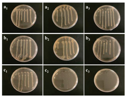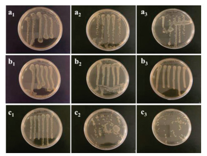 As shown in Figs. 3a, 3b, 4a, 4b, a large number of colonies were found on the culture plates treated by both Fe3O4 and Fe3O4@MPS nanoparticles, respectively, demonstrating that these two nanoparticles were not bactericidal after 6-h incubation. In contrast, the Fe3O4@P(St-co-AcQAC) nanoparticles demonstrated remarkable antimicrobial activity against both Gram-negative E. coli (Fig. 3c) and Gram-positive S. epidermidis (Fig. 4c), and the bacteria-killing capability for the antimicrobial magnetic nanoparticles was more pronounced against S. epidermidis. It also became evident from Figs. 3c and 4c that bacteria-killing of these magnetic particles was time dependent; this is not surprising considering that the antimicrobial mode of action is contact based. After 2-h incubation with the antimicrobial magnetic particles, the number of bacteria (both E. coli and S. epidermidis) only decreased slightly (Figs. 3-c1 and 4-c1). Notably, the 4-h incubation led to more pronounced bacteria-killing, especially for S. epidermidis (Fig. 4-c2); after 6-h incubation, only a small number of E. coli colonies were observed (Fig. 3-c3) and S. epidermidis was completely killed (Fig. 4-c3).