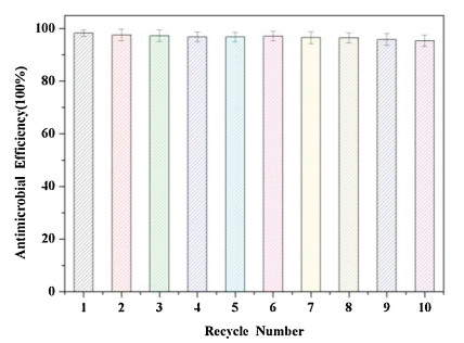 We further examined the antimicrobial performance of recycled Fe3O4@P(St-co-AcQAC) nanoparticles. The recycled antimicrobial magnetic particles were incubated with a fresh bacterial sample (1 mL suspension; magnetic particle concentration: 2 mg/ mL) at 37 ℃ for 6 h under mild stirring. This procedure was repeated for up to 10 times. At the end of each cycle, the Fe3O4@P (St-co-AcQAC) nanoparticles were collected by using a magnet, washed with deionized water, and sterilized for next use. As shown in Fig. 6, the Fe3O4@P(St-co-AcQAC) nanoparticles exhibited high antimicrobial efficiency (≥95%) against E. coli even after 10 cycles. The test results have clearly demonstrated that the bactericidal activity of the Fe3O4@P(St-co-AcQAC) nanoparticles can be effectively maintained after multiple cycles. These antimicrobial magnetic particles appear to be promising, water-insoluble, highefficacy antimicrobial agents for water purification and disinfection.