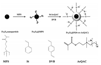 The QAC-containing monomer (AcQAC, Scheme 1) was synthesized by a one-step quaternization by reacting DMAEMA with 1-bromodecane [9]. We used seeded emulsion polymerization to obtain antimicrobial magnetic particles. A typical procedure is as follows. Fe3O4@MPS nanoparticles (40 mg) were dispersed in 50-mL deionized water under mechanical stirring in a three-neck flask equipped with a condenser, a pressure-equalizing addition funnel and N2 inlet and outlet, followed by gentle bubbling with N2. The dispersion was then heated to 75 ℃, followed by the addition of 0.6 mL of potassium persulfate (KPS) aqueous solution (10 mg/mL). Next, a monomer mixture comprising 0.2 g of AcQAC, 0.2 g of styrene, and 0.05 g of DVB was added dropsize to the flask.The reaction lasted for 10 h to ensure complete monomer conversion.