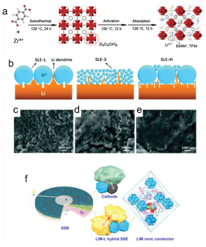 Figure 1 (a)Preparationprocess of nanostructureUiO/Li-IL SEs. Reprinted with permission [38]. Copyright 2019, Wiley VCH. (b)Schematic illustrations of Li plating/stripping processes at the Li/SLE-L, Li/SLE-S and Li/SLE-H interfaces, respectively. (c-e) SEM morphologies of the Li metal surface after Li plating/ stripping cycles of Li|SLE-L|Li, Li|SLE-S|Li and Li|SLE-H|Li symmetric cells, respectively. Reprinted with permission [40]. Copyright 2018, Royal Society of Chemistry. (f) Schematic illustration for the architecture of the SSBs with LIM ionic conductive agent and its working mechanism. The particles with green, yellow, blue, and black color represent the cathode material, LLZO, LIM, and conductive carbon, respectively. Zr6(IV)O4(OH)4 clusters in UiO-67 are shown by blue polyhedrons. The migrating Li+ ions are highlighted by the glowing pink spheres and the [EMIM]+ and [TFSI] ions are randomly distributed in the pores of UiO-67 in Space-Filling model. Hydrogen atoms are omitted in the UiO-67 structure for clarity. Reprinted with permission [41]. Copyright 2018, Elsevier.