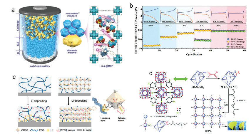 Figure 2 (a) Schematic illustration for the architecture and nanowetted interfacial mechanism of the solid-state battery with a magnification showing crystal structures of the MOF. [EMIM]+ and [TFSI] ions in space-filling model are randomly displayed in the pores of the MOF. The migrating Li+ ions are highlighted by glowing pink spheres. Hydrogen atoms are omitted in MOF structure for clarity. (b) Temperature-dependent cyclability of the Li|Li-IL@MOF|LFP SSBs with corresponding charge/discharge curves. Reprinted with permission [42]. Copyright 2018, Wiley, VCH. (c) Schematic of the Li deposition behavior with PEO (LiTFSI) electrolyte and anion-immobilized P@CMOF electrolyte. Reprinted with permission [44]. Copyright 2019, Elsevier. (d) Synthetic route of the hybrid covalently linked MOF-PEGDA-based all-solid-state electrolyte. Reprinted with permission [46]. Copyright 2018, Royal Society of Chemistry.